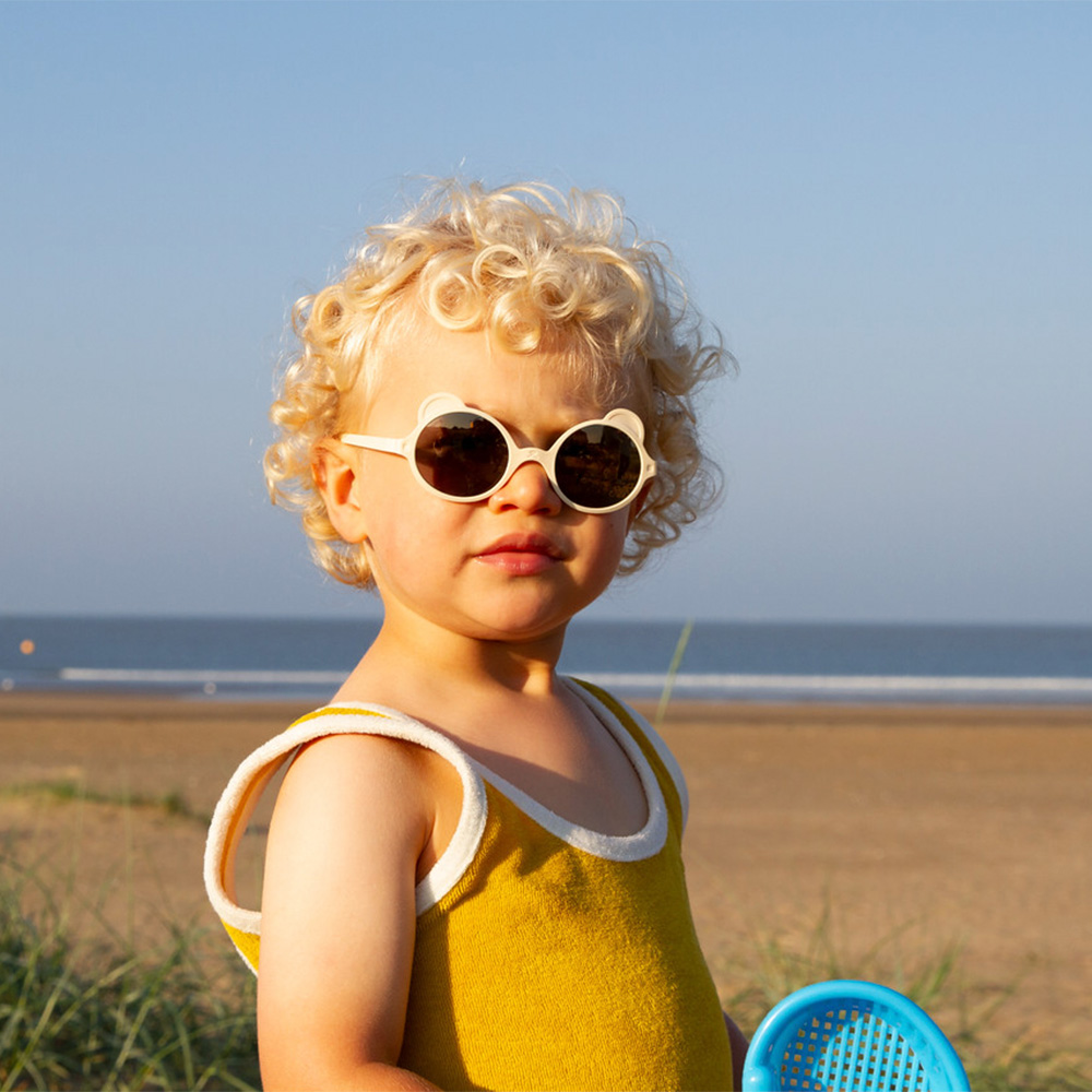 Ki ET LA Ours' On aurinkolasit on tarkoitettu noin 0-2 vuotiaille lapsille. Kevyestä ja pehmoisesta muovista valmistetut trendikkäät aurinkolasit antavat tehokkaasti suojaa lapsen herkille silmille ja tuntuvat miellyttävältä kasvoilla. Niitä voi myös vääntää ja kääntää lähes miten vaan ilman että ne rikkoutuvat. Aurinkolasien mukana tulee irrotettava remmi, jonka avulla ne saadaan pysymään pienen lapsen päässä paremmin.