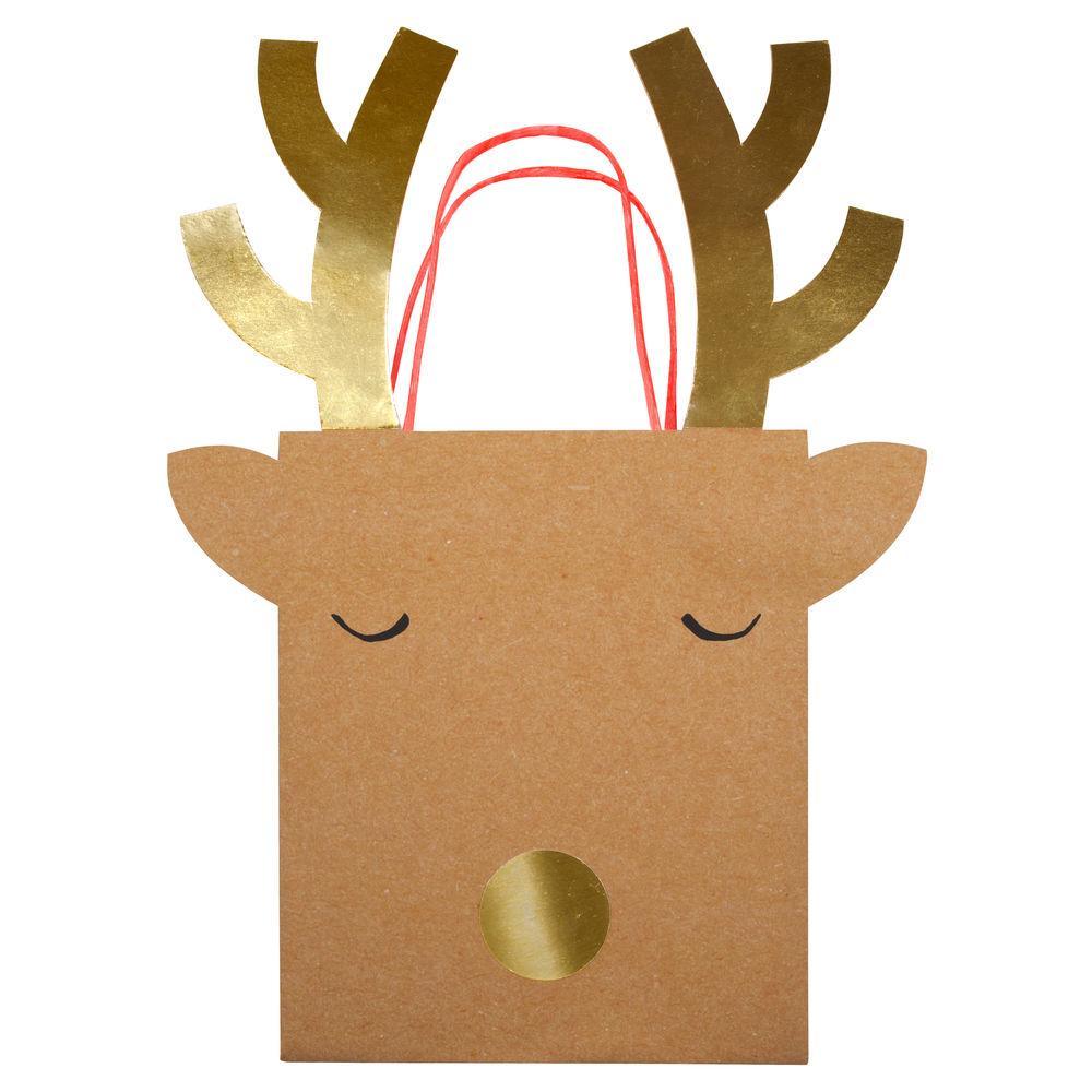 Meri Meri lahjapussi 2 kpl sisältää suloiset poronpään muotoiset lahjakassit. Lahjakassissa on kantokahva ja kultaiset poron sarvet yksityiskohtana.